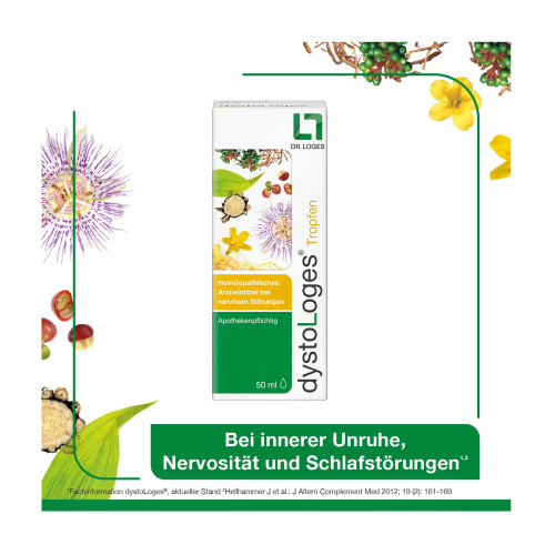 dystoLoges® Tropfen, Mischung zum Einnehmen. Anwendungsgebiete: Die Anwendungsgebiete leiten sich von den homöopathischen Arzneimittelbildern ab. Dazu gehören: Nervöse Störungen. Warnhinweise: Dieses Arzneimittel enthält 6 mg Alkohol (Ethanol) pro 1 Tropfen (20 Vol.-%). Die Menge in 5 Tropfen dieses Arzneimittels entspricht weniger als 1 ml Bier oder 1 ml Wein. Die geringe Alkoholmenge in diesem Arzneimittel hat keine wahrnehmbaren Auswirkungen. Patienten mit der seltenen Glucose-Galactose-Malabsorption sollten dieses Arzneimittel nicht anwenden. Schwefeldioxid kann selten schwere Überempfindlichkeitsreaktionen und Bronchospasmen hervorrufen.