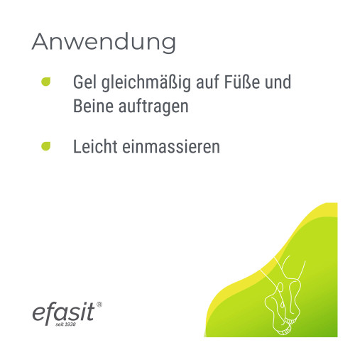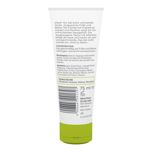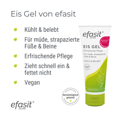 efasit Eis Gel kühlt und belebt müde und strapazierte Füße und Beine. Ideal bei warmen Füßen, im Sommer oder auch nach dem Sport. Die Frische-Formel mit Grapefruitextrakt, Menthol und aktivierendem Duft sorgt für ein frisches Hautgefühl. Die ausgewogene Textur mit Allantoin pflegt die Haut und macht sie zart und geschmeidig. Das Gel zieht schnell ein, ohne zu fetten.