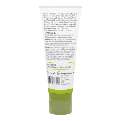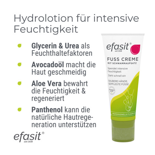 Die efasit Fuß Creme mit Schwammaufsatz ist ideal bei normaler bis trockener Fußhaut. Die Hydrolotion mit Glycerin, Urea, Aloe Vera und Avocadoöl pflegt intensiv und versorgt die Haut mit Feuchtigkeit. Panthenol kann die natürliche Hautregeneration unterstützen. Die Rezeptur zieht schnell ein und fettet nicht. Durch den Schwammaufsatz bleiben Ihre Hände sauber, ein Eincremen ohne klebrige Finger ist damit einfach möglich.