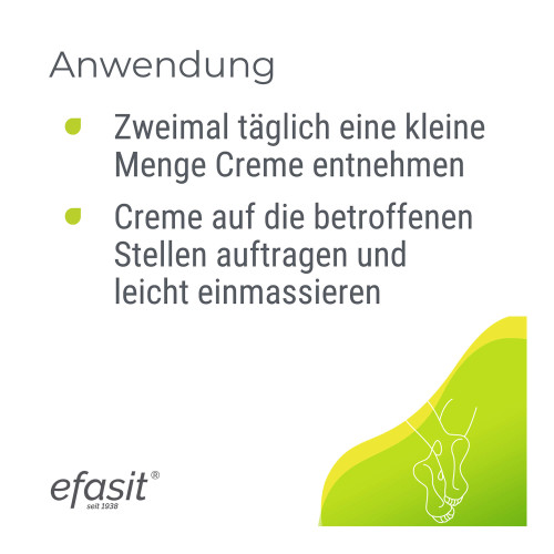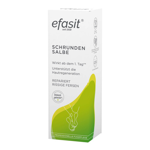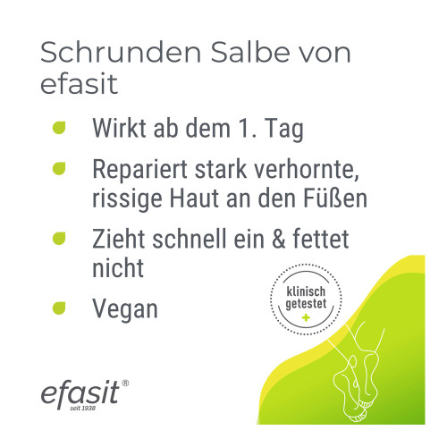 Die efasit Schrunden Salbe ist ideal bei stark verhornten und rissigen Füßen. Durch die einzigartige Formulierung wird die Regeneration der gestörten Hautbarriere angeregt und diese zugleich geschützt. Panthenol und hautverwandte Lipide wie Squalan stärken die Hautbarriere, Nachtkerzenöl kann Entzündungen vorbeugen. Gleichzeitig versorgen Glycerin, Allantoin und Vitamin F die Haut intensiv mit Feuchtigkeit und machen sie weich und geschmeidig. Die reichhaltige Rezeptur zieht schnell ein und fettet nicht.