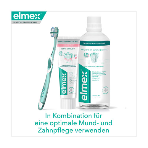elmex® SENSITIVE PROFESSIONAL Repair & Prevent Zahnpasta mit PRO-ARGIN Technologie und Zink. Die einzigartige PRO-ARGIN Technologie repariert sensible Zahnbereiche und bietet sofortige* und lang anhaltende Schmerzlinderung. Zink hilft, das Zahnfleisch zu stärken und dessen Rückgang vorzubeugen – eine der Hauptursachen von Schmerzempfindlichkeit.