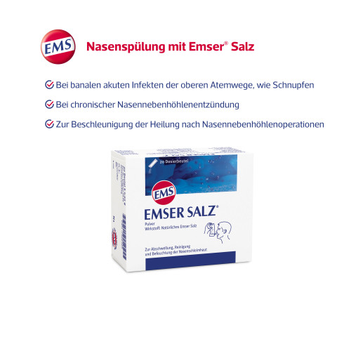 Emser Salz Pulver. Wirkstoff: Natürliches Emser Salz. Anwendungsgebiete: Zur unterstützenden Behandlung durch Befeuchtung, Reinigung und Abschwellung der Nasenschleimhaut bei banalen akuten Infektionen der oberen Atemwege und chronischen Rhinosinusitiden und als begleitende Behandlungsmaßnahme zur Beschleunigung des Heilungsprozesses nach endonasalen Nebenhöhlenoperationen.