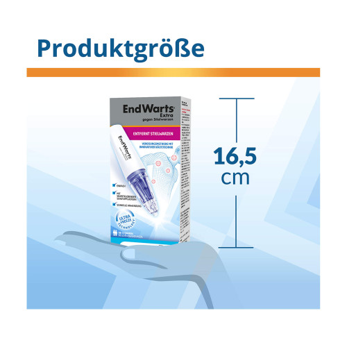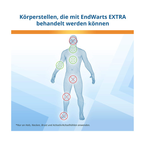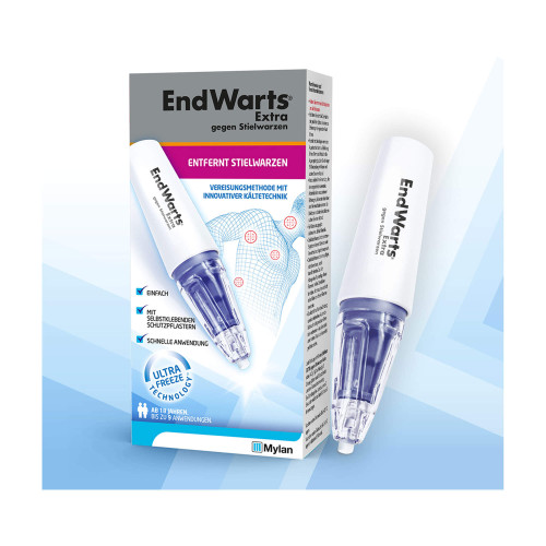 Jede Packung von EndWarts Extra gegen Stielwarzen enthält eine Kartusche (14,3 g N2O verflüssigt), 9 Einweg-Spitzen und Schutzpflaster sowie eine Gebrauchsanweisung. Beachten Sie, dass EndWarts Extra nur zum Entfernen von Stielwarzen vorgesehen ist.