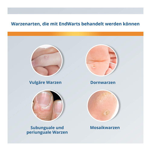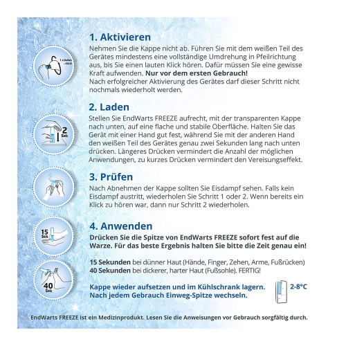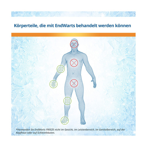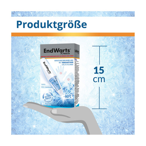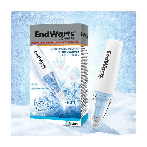 EndWarts Freeze ist eine schnelle Behandlung für zu Hause, die wirksam Warzen (gewöhnliche Warzen und Dornwarzen) an Händen, Armen und Füßen entfernt. In den meisten Fällen ist eine einmalige Behandlung ausreichend. Es ist ein Mittel zur Selbstbehandlung mit dem Gas Distickstoffmonoxid (N2O), das nach der Aktivierung des Gerätes eine Temperatur von etwa -80 °C erreicht und die Warze wirksam vereist.