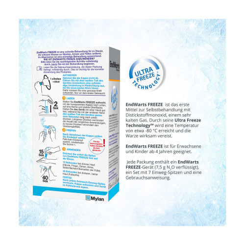 Jede Packung enthält eine EndWarts Freeze-Kartusche mit 7,5 g Distickstoffmonoxid (verflüssigt), ein Set mit 6 Einweg-Spitzen sowie eine Gebrauchsanweisung.