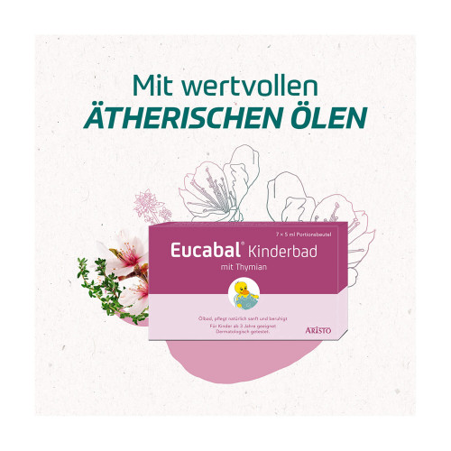 Eucabal® Kinderbad mit Thymian wurde sorgfältig auf die speziellen Bedürfnisse von Kindern abgestimmt. Die enthaltenen Öle pfl egen besonders zarte Kinderhaut auf natürliche Weise. Eucabal® Kinderbad mit Thymian wurde dermatologisch getestet und enthält ausschließlich Substanzen, die für kosmetische Produkte in besonderem Maße geeignet sind.