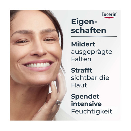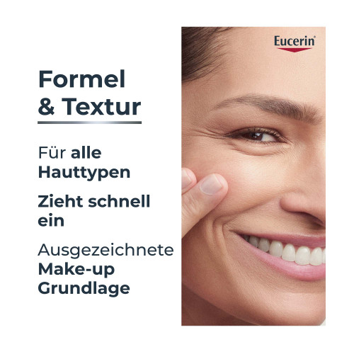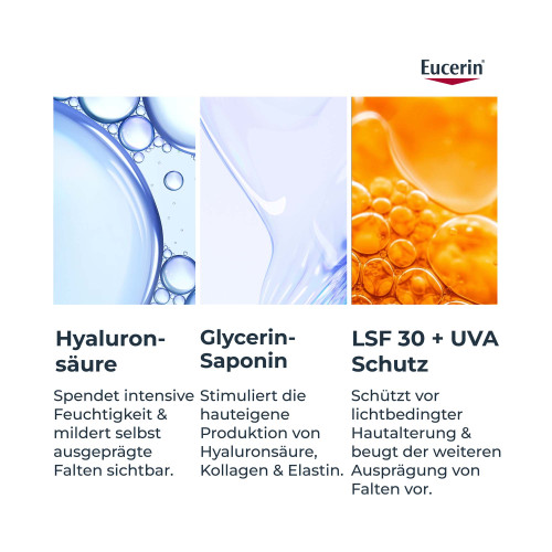Eucerins innovative Formel kombiniert zwei Arten von Hyaluronsäure: Makro- und Mikro-Hyaluronsäure. Makro-Hyaluronsäure versorgt die oberen Hautschichten intensiv mit Feuchtigkeit und sorgt für ein sichtbar glatteres Hautbild. Die 40-mal kleinere Mikro-Hyaluronsäure dringt tiefer in die epidermalen Hautschichten ein, um selbst ausgeprägte Falten von innen heraus aufzupolstern. Zusätzlich angereichert mit LSF 30, UVA-Schutz und antioxidativem Glycin-Saponin schützt die Pflege effektiv vor lichtbedingter vorzeitiger Hautalterung und beugt der weiteren Ausprägung von Falten vor.