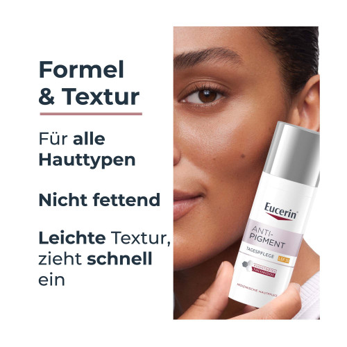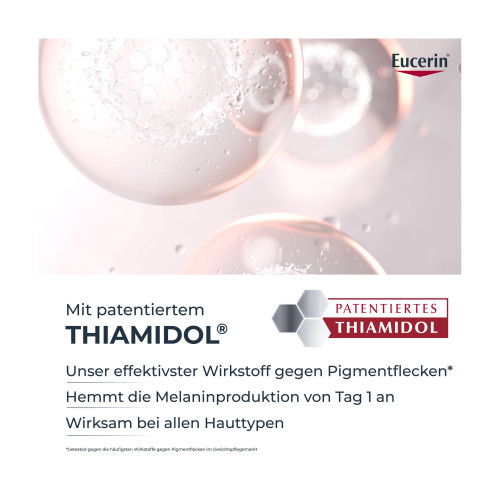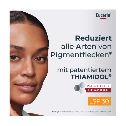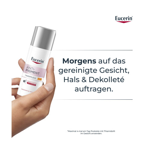 Die Eucerin® Anti-Pigment Tagespflege LSF 30 enthält den effektiven und patentierten Pflegewirkstoff Thiamidol®. Dieser wirkt von Tag 1 an auf die Melaninproduktion an ihrem Ursprung ein und lässt Pigmentflecken nach und nach verblassen. Bereits nach zwei Wochen sind erste Ergebnisse sichtbar, die sich bei regelmäßiger Anwendung deutlich verbessern. Klinische und dermatologische Studien belegen, dass Pigmentflecken aller Art reduziert und ihrer Neuentstehung vorgebeugt wird.