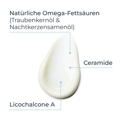 Aqua, Glycerin, Caprylic-Capric-Triglyceride, Vitis Vinifera Seed Oil, Oenothera Biennis Oil, Dimethicone, Pentaerythrityl Tetraisostearate, Triisostearin, Cetyl Alcohol, Glyceryl Stearate, PEG-40 Stearate, Glycyrrhiza Inflata Root Extract, Ceramide NP, Tocopherol, Ascorbyl Palmitate, Citric Acid, Sodium Citrate, 1-2-Hexanediol, Decylene Glycol, Ethylhexylglycerin, Phenoxyethanol.