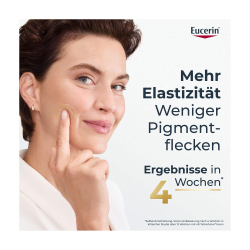Die einzigartige Formel ist speziell formuliert, um fortgeschrittene Zeichen der Hautalterung zu mildern. Die Kombination aus lang- und kurzkettiger Hyaluronsäure von Eucerin spendet Feuchtigkeit und polstert selbst tiefe Falten sichtbar auf. Der neue Kollagen-Elastin-Komplex, eine leistungsstarke Kombination aus Arctiin und Kreatin, stimuliert die Kollagenproduktion und erhöht die Elastizität der Haut. Das patentierte Thiamidol von Eucerin mildert Pigmentflecken und beugt deren Neuentstehung vor. Für eine sichtbar jünger aussehende, glattere und strahlendere Haut.