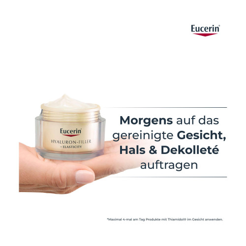 Als Teil der morgendlichen Pflegeroutine die Eucerin Hyaluron-Filler + Elasticity Tagespflege LSF 30 auf das gereinigte Gesicht, den Hals und das Dekolleté auftragen. Sanft in die Haut einmassieren.