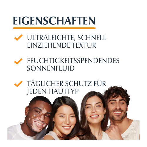 Eucerin Hydro Protect Ultraleichtes Face Sun Fluid LSF 50+ bietet einen leichten, angenehmen Duft und hat eine ultraleichte, nicht fettende, nicht klebende, sofort einziehende Textur, die nach der Anwendung keine Rückstände hinterlässt.