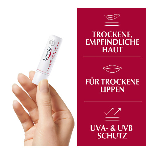 Eucerin Lip Active wurde extra für spröde, rissige und empfindliche Lippen entwickelt. Die Lippenpflege enthält Dexpanthenol, Vitamin E und natürliche Sheabutter. Die Inhaltsstoffe der Eucerin Lip Active Lippenpflege beruhigen, befeuchten und schützen vor alltäglichen äußeren Einflüssen wie UV-Belastung und geringer Feuchtigkeitszufuhr.