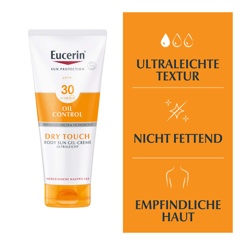 Die Eucerin Oil Control Body Sun Gel-Creme mit Lichtschutzfaktor 30 schützt den ganzen Körper zuverlässig vor sonnenbedingten Hautschäden. Mit der ultra leichten Textur zieht die Sonnencreme fürs Gesicht und den Körper in wenigen Sekunden ein, hinterlässt keine Rückstände und fettet nicht.