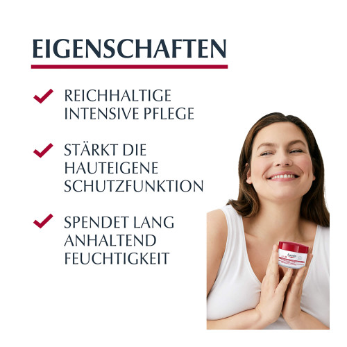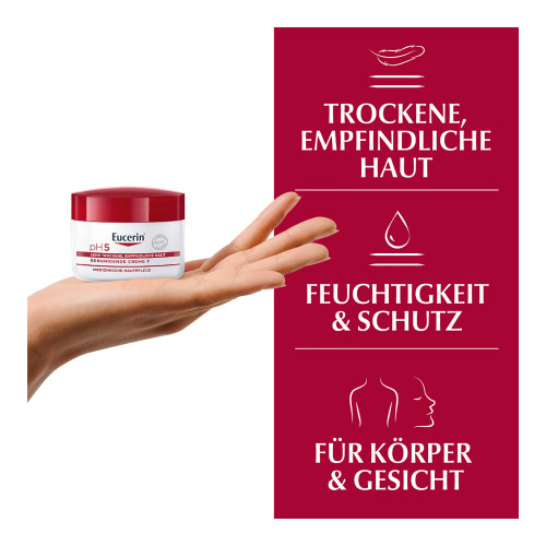 Eucerin pH5 Creme F wurde speziell entwickelt, um empfindliche und sehr trockene Gesichts- und Körperhaut intensiv zu pflegen. Das einzigartige Eucerin pH Balance System mit dem pH5 Citratpuffer stellt den natürlichen pH-Wert der Haut wieder her. Gleichzeitig hilft 3% Dexpanthenol die Regeneration der Haut zu stimulieren und deren Widerstandskraft zu bewahren.