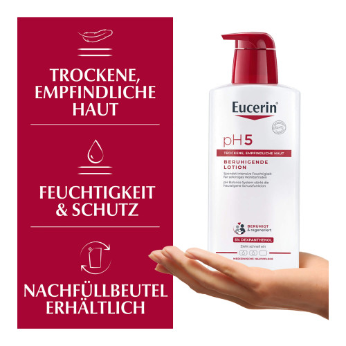 Die Eucerin pH5 Beruhigende Lotion ist eine sanfte, aber wirksame Körperpflege, die speziell entwickelt wurde, um trockene, empfindliche Haut zu stärken und widerstandsfähiger zu machen. Das einzigartige Eucerin pH Balance System mit dem pH5 Citratpuffer stellt den natürlichen pH-Wert der Haut wieder her. Gleichzeitig hilft 5% Dexpanthenol (Provitamin B5) die Regeneration der Haut zu stimulieren und deren Widerstandskraft zu bewahren.