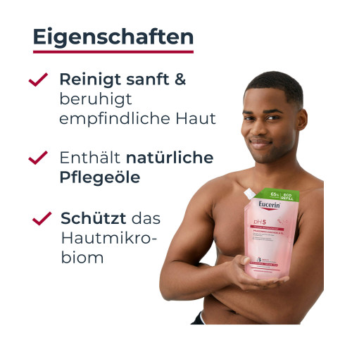 Das Duschgel bei empfindlicher Haut täglich anwenden und die Pflegeroutine mit Eucerin pH5 Pflegeprodukten vervollständigen. Direkten Augenkontakt vermeiden.