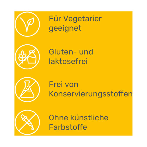 Nur mit veganen oder vegetarischen Zutaten. Ohne Gelatine. Ohne Konservierungsstoffe. Ohne künstliche Farbstoffe. Gluten- und laktosefrei.