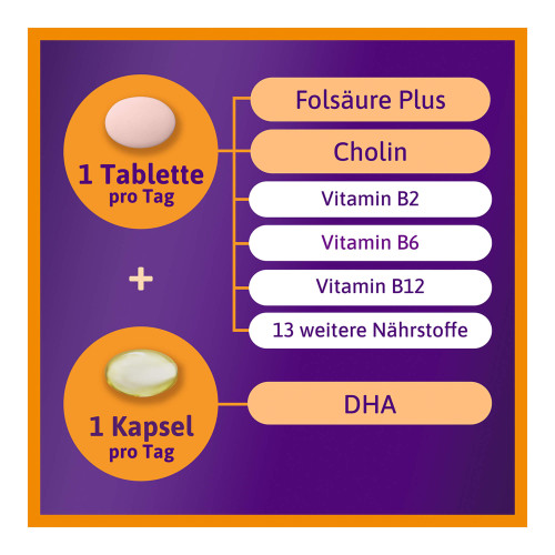 Nahrungsergänzungsmittel mit Folat (Folsäure & Metafolin), Cholin, DHA, Vitamin B2, B6, B12 und weiteren Vitaminen und Mineralstoffen.