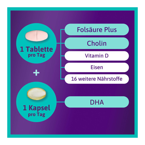Tablette: Tricalciumphosphat, Cholinbitartrat, Füllstoff: Mikrokristalline Cellulose, Vitamin C (Calcium-L-ascorbat), Eisenbisglycinat, Überzugsmittel: Hydroxypropylmethylcellulose, Polyvinylalkohol, Hydroxypropylcellulose, Polyethylenglycol, Talkum, Füllstoff: Vernetzte Natriumcarboxymethylcellulose, Trennmittel: Calciumphosphate, Magnesiumsalze der Speisefettsäuren, Niacin (Nicotinamid), Stärke; Maltodextrin, Farbstoff: Calciumcarbonat, Eisenoxide und Eisenhydroxide, Zinkoxid, Vitamin E (DL-α-Tocopherylacetat), Pantothensäure (Calcium-D-pantothenat), Glukosesirup, Emulgator: Gummi arabicum, Zucker, Modifizierte Stärke, Vitamin B6 (Pyridoxinhydrochlorid), Kupfersulfat, Vitamin B2 (Riboflavin), Vitamin B1 (Thiaminmononitrat), Vitamin A (Retinylacetat), Calcium-L-methylfolat, Folsäure (Pteroylmonoglutaminsäure), Kaliumiodid, Natriumselenat, Biotin (D-Biotin), Vitamin D (Cholecalciferol), Vitamin B12 (Cyanocobalamin).