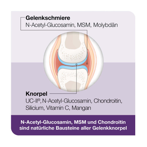 Abend-Kapseln: N-Acetyl-Glucosamin (aus Krebstieren)), Methylsulfonylmethan, Chondroitinsulfat, Kapselhülle: Hydroxypropylmethylcellulose; L-Ascorbinsäure (Vitamin C), natives Kollagen (Kollagen Typ II), Füllstoff: Cellulose; Trennmittel: Magnesiumsalze der Speisefettsäuren, Siliciumdioxid; Manganbisglycinat, Überzugsmittel: Mono- und Diglyceride von Speisefettsäuren; Stabilisator: Kaliumchlorid; Farbstoff: Kupferhaltige Komplexe der Chlorophylle und Chlorophylline; Antioxidationsmittel: Citronensäure; Natriummolybdat-Dihydrat.