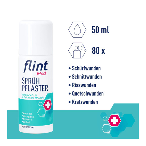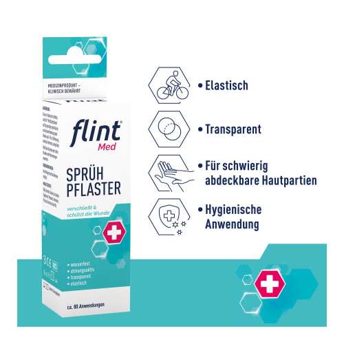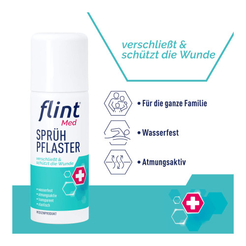 Das praktische flint Med Sprühpflaster wird bei oberflächlichen Wunden und kleinen Verletzungen der Haut, wie z.B. Schürf-, Schnitt-, Riss-, Quetsch- und Kratzwunden verwendet. Es deckt auch Hautpartien ab, die mit herkömmlichen Pflastern nicht geschützt werden können. Das flint Med Sprühpflaster ist leicht anzuwenden; nach der Reinigung verschließt es die Wunde sofort und verhindert so das Eindringen von Schmutz, Viren und Bakterien.
