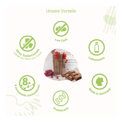 Zubereitung: Pro Portion 30 g Pulver (= 2 gehäufte Esslöffel) mit 200 ml Magermilch ( 0,3 % Fett) oder Wasser mit einem Schneebesen verrühren, alternativ auch in einem Mixbecher schütteln oder in einem elektrischen Mixer zubereiten.