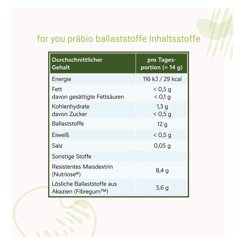 60 % resistentes Maisdextrin (Nutriose), 40 % lösliche Ballaststoffe aus Akazien (Fibregum).*