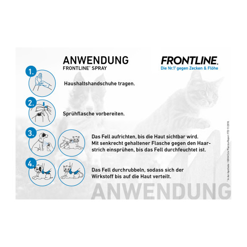 Frontline Spray 2,5 mg/ml, Spray zur Anwendung auf der Haut, Lösung für Hunde und Katzen. Wirkstoff: Fipronil. Anwendungsgebiete: Zur Behandlung von Hunden und Katzen gegen Floh-, Zecken- und Haarlingsbefall.