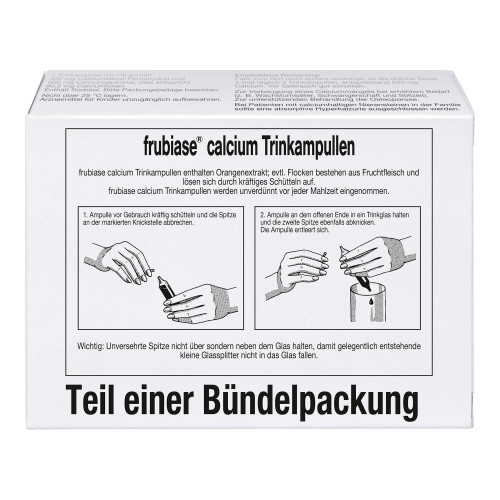 frubiase® calcium Trinkampullen. Anwendungsgebiete: Zur Vorbeugung eines Calciummangels bei erhöhtem Bedarf (z. B. Wachstumsalter, Schwangerschaft und Stillzeit), zur unterstützenden Behandlung der Osteoporose. Warnhinweise: Enthält Benzylakohol und Sorbitol. Enthält 1,49 mg Alkohol (Ethanol) pro Trinkampulle (10 ml).