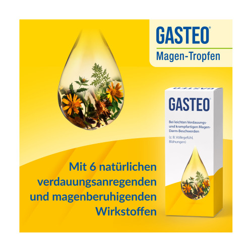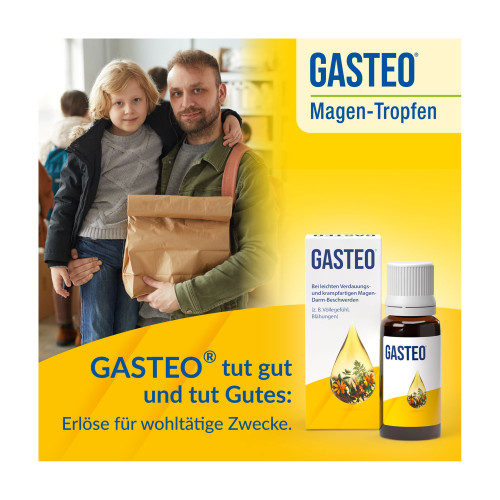 Gasteo®, Flüssigkeit zum Einnehmen. Anwendungsgebiete: Traditionelles pflanzliches Arzneimittel zur Anwendung bei leichten Verdauungsbeschwerden (z.B. Völlegefühl, Blähungen), sowie leichten krampfartigen Beschwerden im Magen-Darm-Trakt ausschließlich auf Grund langjähriger Anwendung. Warnhinweis: Enthält 40 % Vol.-Alkohol.