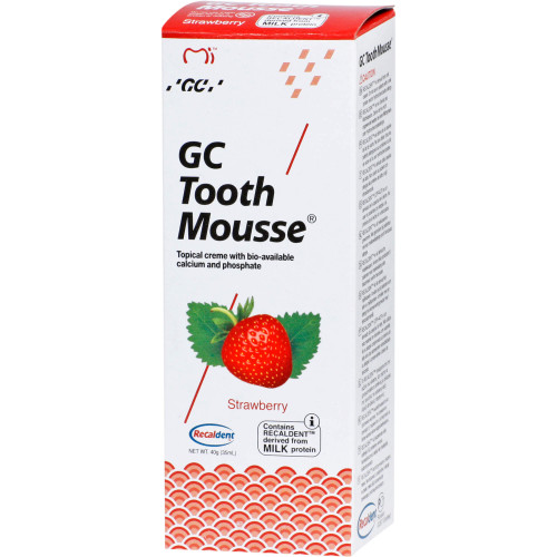 Das neue GC Tooth Mousse enthält Recaldent eine CPP-ACP-Formel (Casein Phosphopeptide - Amorphus Calcium Phosphate) mit frei verfügbarem Calcium und Phosphat. GC Tooth Mousse ist somit weltweit das erste Produkt für den professionellen Einsatz in der Zahnarztpraxis, das diesen neuartigen Stoff CPP-ACP enthält. Das wohlschmeckende GC Tooth Mousse schützt die Zähne und gleicht auf einzigartige Weise den natürlichen Säurehaushalt im Mund aus.