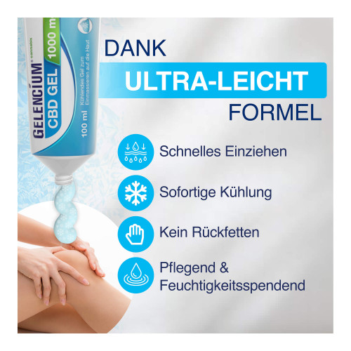 Das Gelencium Cannabis CBD Gel 1000 mg der führenden Apothekenmarke GELENCIUM ist ein extra-hochdosiertes CBD Gel (1000 mg CBD pro Tube) mit einem stark kühlenden Sofort-Effekt für Muskeln und Gelenke: