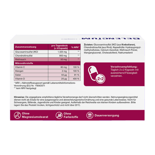 GELENCIUM® Glucosamin Chondroitin ist ein modernes, hochdosiertes Komplexpräparat der führenden Arthrose-Apothekenmarke GELENCIUM®. Dieses kombiniert erstmalig die essenziellen Gelenkbausteine Glucosamin und Chondroitin mit Weihrauch und ausgewählten Mikronährstoffen für die Gelenkgesundheit. Im Wettbewerbsvergleich herausragend ist die einzigartig hohe Tagesdosis von 2.325 mg Glucosaminsulfat + Chondroitinsulfat. Als ideale Ergänzung ist Weihrauch mit den entzündungshemmenden Boswelliasäuren enthalten. Die optimal aufeinander abgestimmten Mikronährstoffe Vitamin C, Vitamin D und Mangan unterstützen die Gelenkgesundheit (Knorpel1, Knochen2, Muskeln3, Bindegewebe4) zusätzlich.