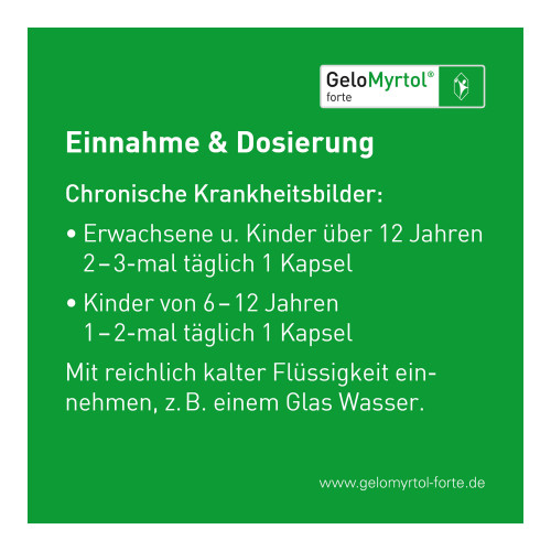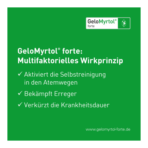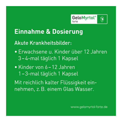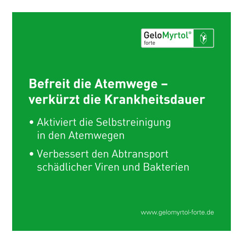 GeloMyrtol® forte 300 mg, magensaftresistente Weichkapseln. Anwendungsgebiete: Zur Schleimlösung und Erleichterung des Abhustens bei akuter und chronischer Bronchitis. Zur Schleimlösung bei Entzündungen der Nasennebenhöhlen (Sinusitis). Zur Anwendung bei Erwachsenen, Jugendlichen und Kindern ab 6 Jahren. Warnhinweis: Enthält Sorbitol.
