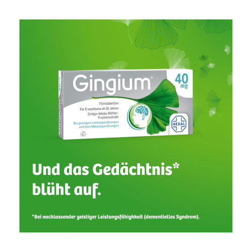 Gingium® 40 mg Filmtabletten. Wirkstoff: Ginkgo-biloba-Blätter-Trockenextrakt. Anwendungsgebiete: Zur symptomatischen Behandlung von hirnorganisch bedingten geistigen Leistungseinbußen im Rahmen eines therapeutischen Gesamtkonzeptes bei Abnahme bzw. Verlust erworbener geistiger Fähigkeiten (dementiellen Syndromen) mit den Hauptbeschwerden: Gedächtnisstörungen, Konzentrationsstörungen, Niedergeschlagenheit, Schwindel, Ohrensausen, Kopfschmerzen. Das individuelle Ansprechen auf die Medikation kann nicht vorausgesagt werden. Bevor die Behandlung mit diesem Arzneimittel begonnen wird, sollte geklärt werden, ob die Krankheitszeichen nicht auf einer spezifisch zu behandelnden Grunderkrankung beruhen. Zur Verlängerung der schmerzfreien Gehstrecke bei arterieller Verschlusskrankheit in den Gliedmaßen, sog. „Schaufensterkrankheit“ (Claudicatio intermittens im Stadium II nach FONTAINE) im Rahmen physikalisch-therapeutischer Maßnahmen, insbesondere Gehtraining. Bei Schwindel infolge von Durchblutungsstörungen oder altersbedingten Rückbildungsvorgängen (Vertigo vaskulärer und involutiver Genese). Zur unterstützenden Behandlung von Ohrgeräuschen infolge von Durchblutungsstörungen oder altersbedingten Rückbildungsvorgängen (Tinnitus vaskulärer und involutiver Genese). Häufig auftretende Schwindelgefühle und Ohrensausen bedürfen grundsätzlich der Abklärung durch einen Arzt. Bei plötzlich auftretender Schwerhörigkeit bzw. einem Hörverlust sollte unverzüglich ein Arzt aufgesucht werden. Warnhinweis: Enthält Glucose und Lactose.