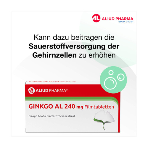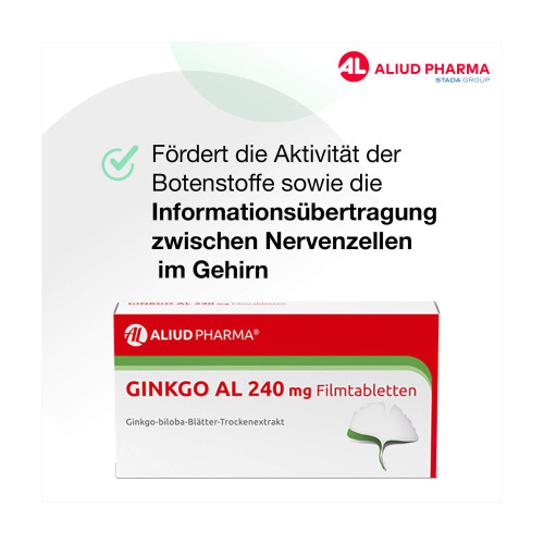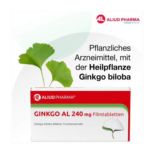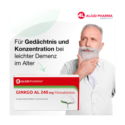 Ginkgo AL 240 mg Filmtabletten. Wirkstoff: Ginkgo-biloba-Blätter-Trockenextrakt. Anwendungsgebiete: Pflanzliches Arzneimittel zur Verbesserung einer altersbedingten kognitiven Beeinträchtigung und der Lebensqualität bei leichter Demenz. Warnhinweise: Enthält Lactose und Glucose.