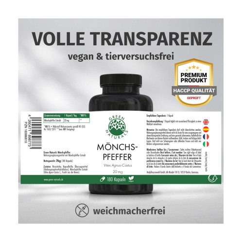 GREEN NATURALS Mönchspfeffer 180 Kapseln ist ohne Konservierungsstoffe.
