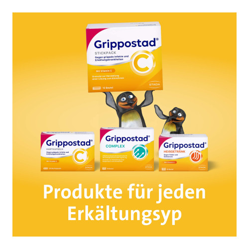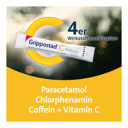 Grippostad C Stickpack, Granulat zur Herstellung einer Lösung zum Einnehmen. Anwendungsgebiete: Zur Anwendung bei Erwachsenen. Zur Behandlung von gemeinsam auftretenden Beschwerden wie Kopf- und Gliederschmerzen, Schnupfen und Reizhusten im Rahmen einer einfachen Erkältungskrankheit. Bei gleichzeitigem Fieber oder erhöhter Körpertemperatur wirkt Grippostad® C STICKPACK fiebersenkend. Grippostad® C STICKPACK enthält mehrere Wirkstoffe, die jeweils in einer festgelegten Menge dosiert sind. Daher kann die Dosis nicht individuell angepasst werden, wenn Sie überwiegend unter einem der oben genannten Symptome leiden. Sprechen Sie in solchen Fällen bitte mit Ihrem Arzt oder Apotheker, dieser wird Ihnen ein Arzneimittel anderer Zusammensetzung empfehlen. Warnhinweis: Schmerzmittel sollen über längere Zeit oder in höheren Dosen nicht ohne Befragen des Arztes eingenommen werden. Enthält: Natriumverbindungen.