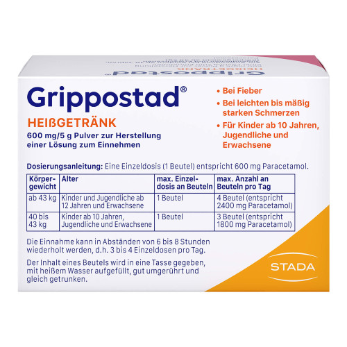 Grippostad® HEIßGETRÄNK darf bei Kindern unter 10 Jahren sowie Patienten mit einem Körpergewicht unter 40 kg nicht angewendet werden, da die Dosisstärke für diese Patienten nicht geeignet ist.