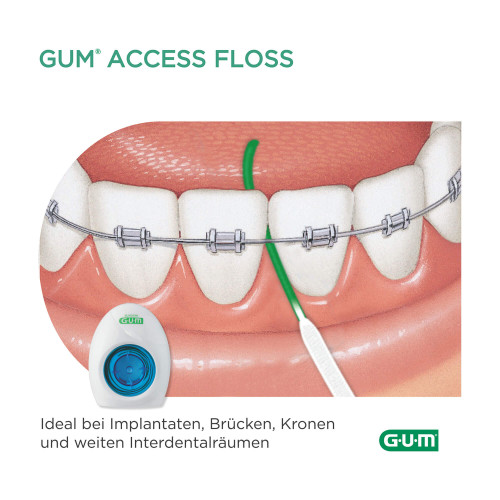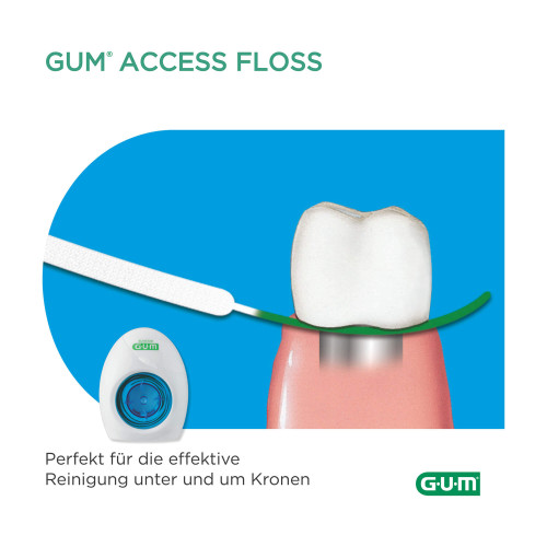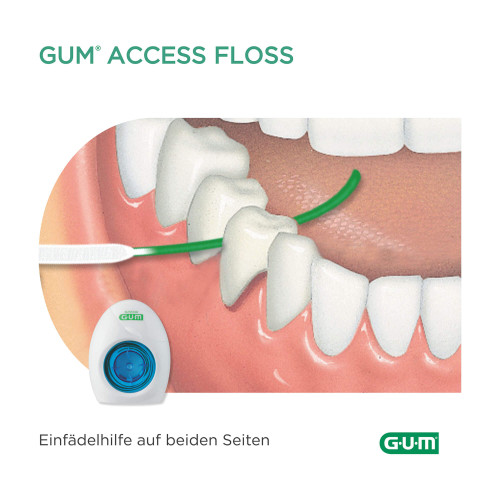 Dank der Einfädelhilfe ist die GUM Access Floss Zahnseide super leicht zu verwenden. Sie eignet sich perfekt für die effektive Reinigung unter und um Kronen, Brücken, Implantaten und großen Zahnzwischenräumen. Der Flauschfaden passt sich an verschieden große Zahnzwischenräume an und sorgt so für mehr Kontakt mit der Zahnoberfläche.