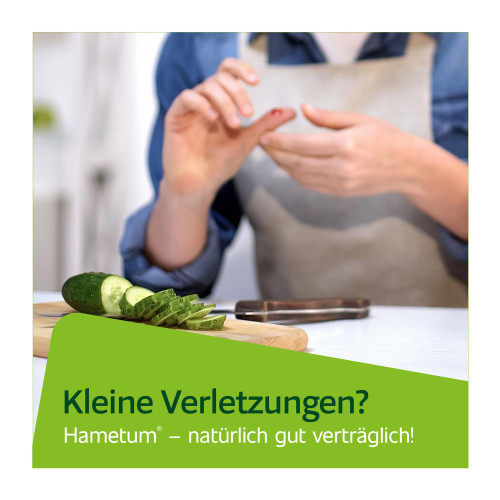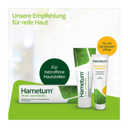 Hametum® Wund- und Heilsalbe. Wirkstoff: Hamamelisdestillat. Anwendungsgebiete: Bei leichten Hautverletzungen, kleinflächigen Entzündungen der Haut und Schleimhäute. Warnhinweis: Enthält Wollwachs, Butylhydroxytoluol, Cetylstearylalkohol und Propylenglycol.
