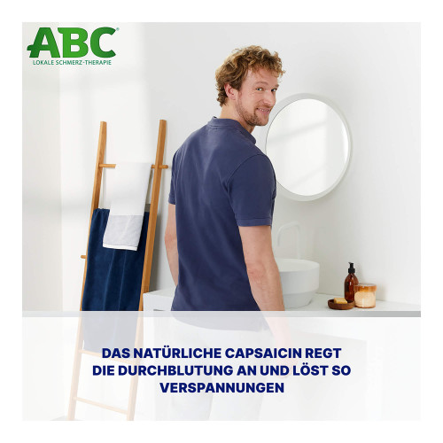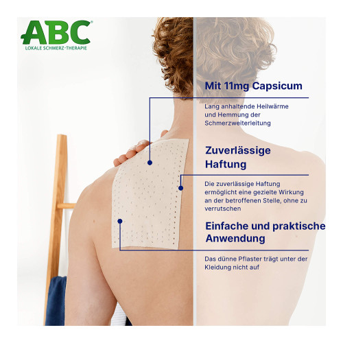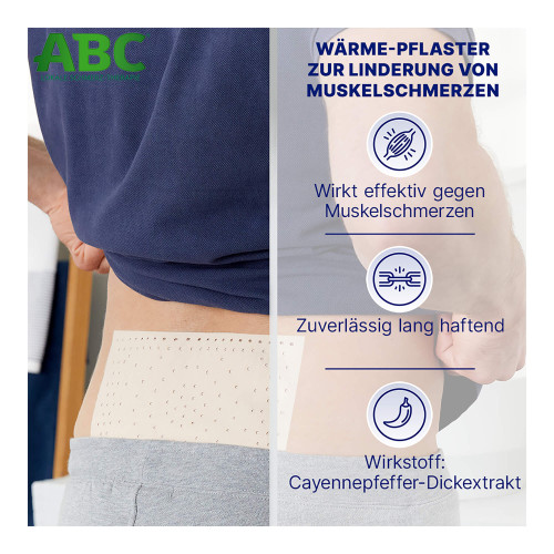 ABC Lokale Schmerz-Therapie Wärme-Pflaster Capsicum 11 mg wirkstoffhaltiges Pflaster. Wirkstoff: Cayennepfeffer-Dickextrakt. Anwendungsgebiete: ABC Wärme-Pflaster wird äußerlich angewendet zur Linderung von Muskelschmerzen, z. B. Schmerzen im unteren Rückenbereich. Warnhinweis: Enthält Wollwachs.