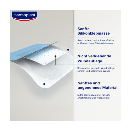 Der Wundverbande Hansaplast Ultra Sensitive XL ist ein sanft haftende Silikonpflaster für die Versorgung mittelgroßer und größerer Wunden, wie sie im Alltag entstehen können. Es ist geeignet bei sehr empfindlicher Haut.