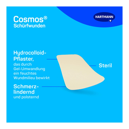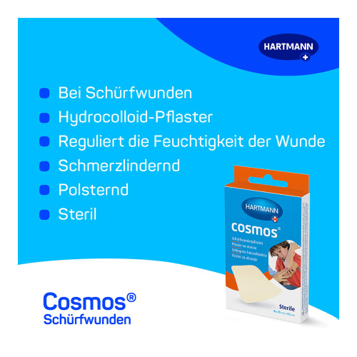 Cosmos Schürfwundenpflaster reguliert die Feuchtigkeit der Wunde. Das Hydrokolloid-Pflaster schafft ein feuchtes Wundmilieu und fördert so die Wundheilung. Die polsternde Eigenschaft des sterilen Pflasters trägt zur Schmerzlinderung bei.