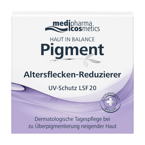 Hormonelle Einflüsse und Sonneneinstrahlung können für dunkle Flecken auf der Haut verantwortlich sein. Überpigmentierungen, wie z.B. Altersflecken und Sommersprossen, können sich ergeben. Die dermatologische Tagespflege von HAUT IN BALANCE Pigment wirkt intensiv gegen dunkle Hautstellen wie Alters- oder Pigmentflecken. Die enthaltene Wirkstoffkombination hellt die betroffenen Stellen sichtbar auf. Der Teint erscheint ebenmäßiger und die Haut wird intensiv gepflegt. LSF 20 schützt vor der Bildung neuer Pigmentflecken.