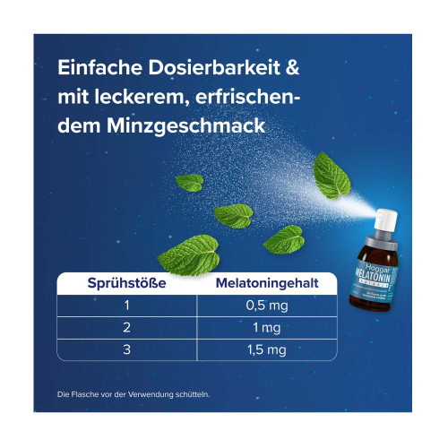 Zur Verkürzung der Einschlafzeit 2 Sprühstöße (= 1 mg Melatonin) pro Tag ca. 30 Minuten vor dem Schlafengehen direkt in den Mund sprühen. Die positive Wirkung stellt sich ein, wenn kurz vor dem Schlafengegen 1mg Melatonin aufgenommen wird.