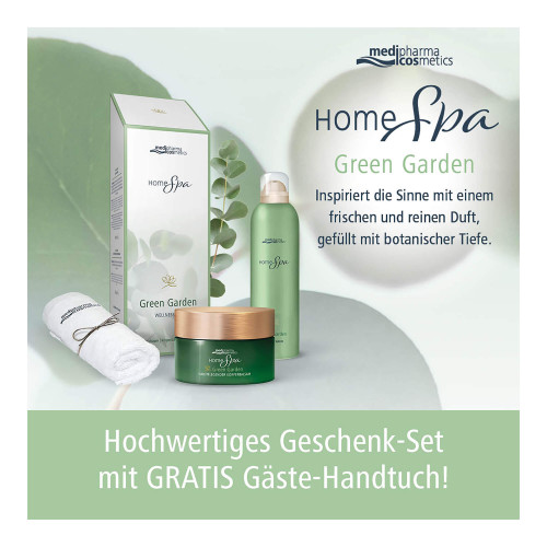 Schenken Sie Ihren Liebsten eine Auszeit! Home Spa Green Garden ist eine Wellness-Produktserie mit Bio-Eukalyptus-Extrakt, die mit einem belebend-frischen Duft die Sinne verwöhnt. Die Green Garden-Serie im Set mit einem gratis Gästehandtuch* eignet sich ideal als Geschenk zu Weihnachten, Geburtstage, Muttertag oder einfach so!