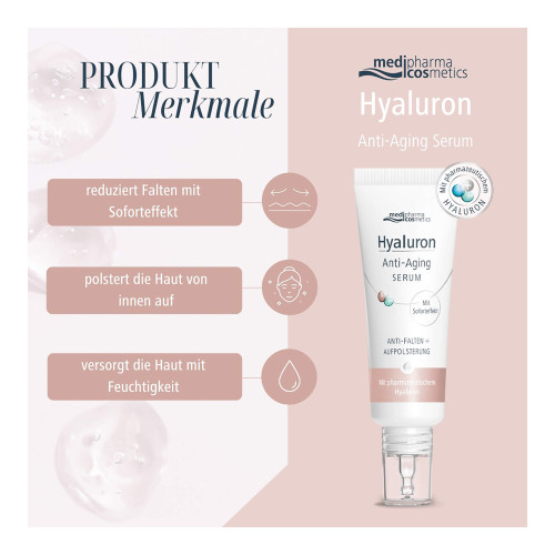 Das Anti-Aging Serum versorgt die Haut im Gesicht, am Hals und am Dekolleté mit reichhaltiger Feuchtigkeit, für ein geschmeidiges und angenehmes Hautgefühl. Das Serum eignet sich im Alltag unter der Tagespflege, als Grundierung. Eine kombinierte Anwendung mit dem reinigenden Hyaluron Waschgel und dem Hyaluron Anti-Aging Cremegel vervollständigt eine optimale Pflegeroutine.
