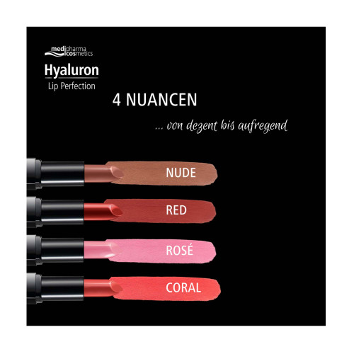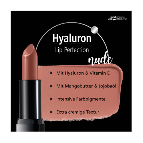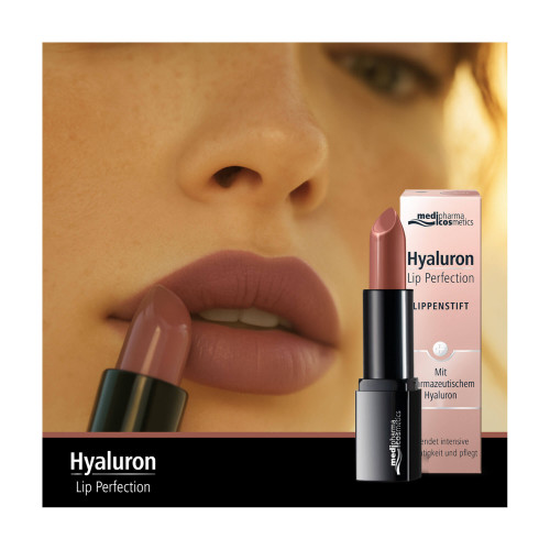 Tipp: Für ein perfektes Gesamtbild kombinieren Sie den Hyaluron Lippenstift mit der Hyaluron Nude Perfection Tagespflege (PZN 14406496, PZN 14406504 oder PZN 14406510) für einen ebenmäßigen Teint und der Mascara med (PZN 13502476), die das natürliche Wimpernwachstum stimuliert und für einen intensiven Augenaufschlag sorgt.